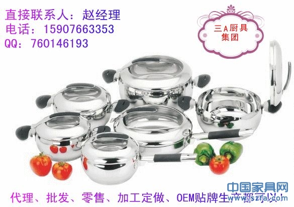 高檔不銹鋼廚具、湯鍋、炒鍋、煎鍋、奶鍋、蒸鍋、刀叉、碗筷碟子等眾多款式,批發(fā)、零售、代理還可以加工定做,OEM貼牌生產(chǎn)!廠家直銷!!!櫥柜、炊具等產(chǎn)品配套的最佳選擇!消費(fèi)者最愛的禮品,贈(zèng)品!
