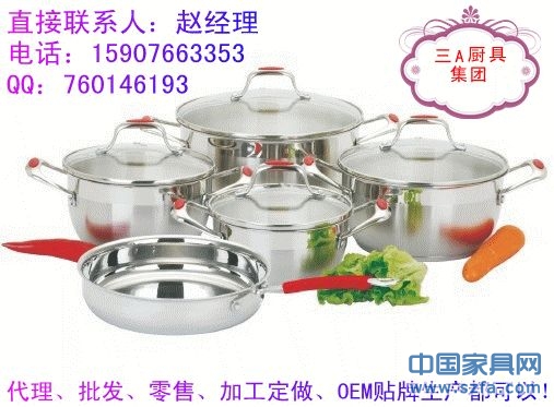 高檔不銹鋼廚具、湯鍋、炒鍋、煎鍋、奶鍋、蒸鍋、刀叉、碗筷碟子等眾多款式,批發(fā)、零售、代理還可以加工定做,OEM貼牌生產(chǎn)!廠家直銷!!!櫥柜、炊具等產(chǎn)品配套的最佳選擇!消費者最愛的禮品,贈品!