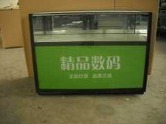 靠墻擺放的手機展柜背板為不透光板,可選與柜體外觀一樣的顏色、白色或者鏡面。頂部可裝燈箱片,柜內燈可選日光燈、射燈,頂部帶燈箱。高度,寬度,長度可以根據使用調整。