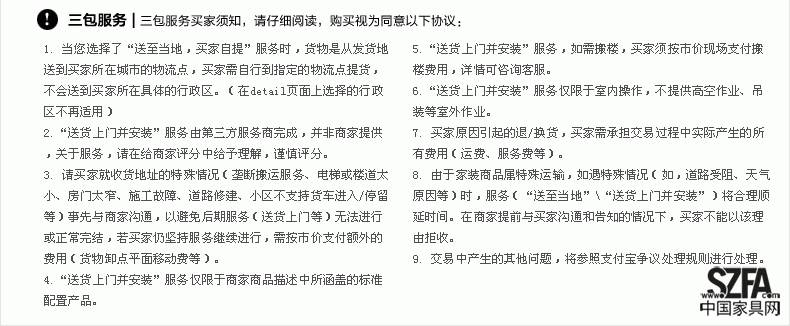 | 【主材料】 | 1.產品主框架均采用實木,其他結構包含部分復合板材; 2.所有板材都經過消甲醛處理,板材甲醛釋放量均優于環保水平,保證了家具的環保安全和無污染; 3.世界一流涂裝工藝,各項指標均符合GB18581-2001的標準要求,符合人體健康和環保的時代要求; 4.知名品牌五金件,長久使用不變形. |