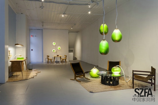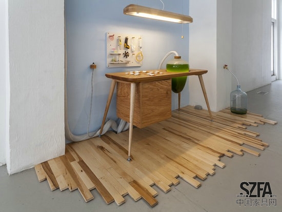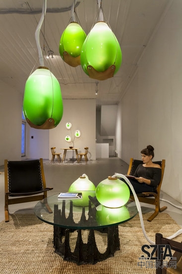 這間屋子里的燈具看上去真的很有魔力,幽幽的綠光好想女巫調制的毒液。其實這些器皿中的綠色液體是一種微型藻類生物。裝置名為Living Things ,由建筑師Jacob Douenias與產品設計師Ethan Frier聯合設計。這組作品的目的在于通過融合到家居中的裝置培育出生命,探索其余人類與這種光合作用藻類的共生關系。