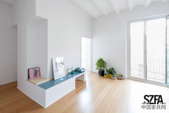 改造墻壁時,我們將小開口連接起來作為入口處背對臥室角落的長凳,也可以作為一個陽臺使用,還可以俯瞰街道。