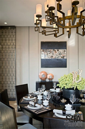 對(duì)自然的人工化,才能實(shí)現(xiàn)人與神的溝通。餐廳地臺(tái)沿用富有水墨肌理感的銀灰洞石,搭配深色的餐桌及餐椅,倍顯尊貴雅致。廳側(cè)背景墻以具地方特色的雨花石為裝飾畫主題,更于現(xiàn)代風(fēng)尚中流露幾分溫婉秀雅的東方情懷。