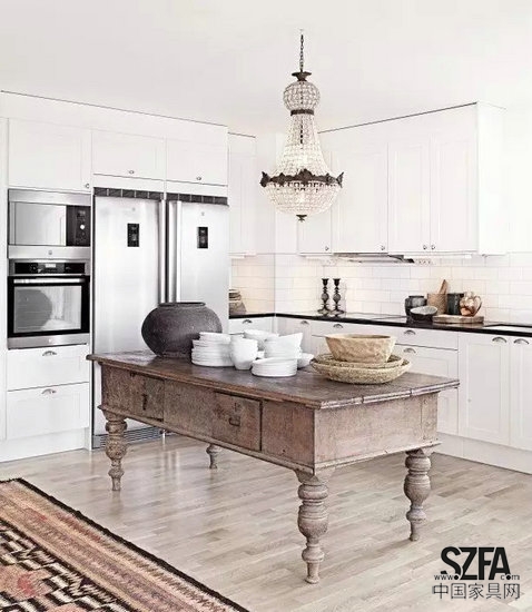 異常出彩的餐桌與復(fù)古吊燈讓原本平淡的廚房瞬間逼格爆棚。