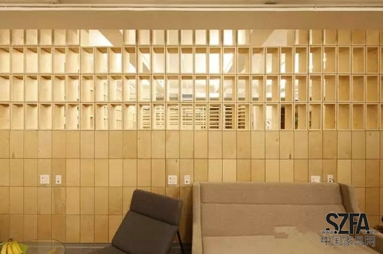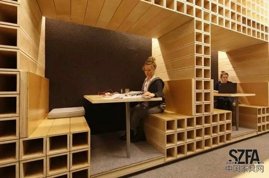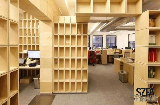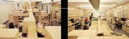 Taylor and Miller為他們開發了辦公室隔墻和家具系統,都是由不同尺寸和直線形狀的基本膠合板箱做成的。由多個隨機的方式安排的盒子組成了隔墻,這樣就允許了空間中的視覺連通性,當移動到新的空間后,原來的盒子被重新組織,用了單一的盒子形狀來搭建整面隔墻。對于設計師來說,這個想法是:隨著辦公室的擴展,在新的空間里增加了更多的勞動力,在人口密度增加和任務有重疊的情況下,辦公有一定程度的紊亂,該建筑體系的設計,將抵消這一混亂走向;盒子的重復性和紋理將這個工作間與下一個工作間分開,給員工提供了一個安靜的空間和隱私分層。