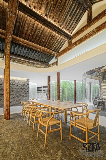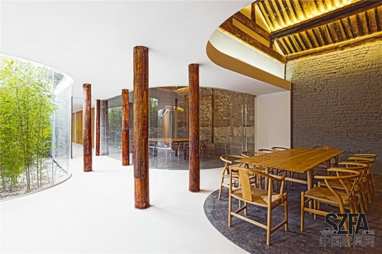在傳統建筑中,廊是一種半內半外的空間形式,它的曲折多變、高低錯落,大大增加了游園的樂趣。猶如樹枝分岔的曲廊從室外伸展到舊建筑內部,模糊了院與房的邊界,改變院子呆板狹窄的印象。輕盈、透明、純白的廊空間與厚重、滄桑、灰暗的舊建筑形成氣質上的反差,新的更新、老的更老,拉開時間上的層疊,新與舊相互產生對話。曲廊在原有院子中劃分了三個錯落的弧形小院,使每一個茶室有獨立的室外景致,在公共和私密之間產生過渡。曲廊的玻璃幕墻好似一個懸浮地面之上的弧形屏幕,將竹林景觀和舊建筑形式投射到茶室之中,新與舊的影像相互疊加。曲廊同時具有舊建筑的結構作用,廊的鋼結構梁柱替換了局部舊建筑中腐朽的木材,使新與舊“長”在了一起。