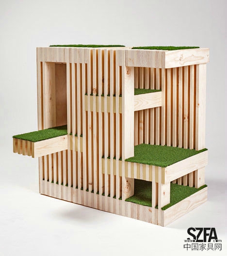 Wolcott Architecture Interiors 的貓屋有幼兒園的即視感。下面這些貓屋更像是游樂場,有各種錯(cuò)落的支點(diǎn)讓貓咪爬上爬下,不過遮風(fēng)擋雨的功能嘛,幾乎沒有。