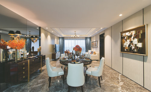 客廳及餐廳方正大氣,超豪華大面寬保證了充足的采光與景觀視野面。在一個手工羊毛地毯的裝飾下變得生動起來,別致的主題元素圖案,橙色和白色的家具搭配具有視覺沖擊力,整體視覺效果帶有一種戲劇性的色彩。餐廳高光黑檀餐桌金屬鑲邊貴氣且與餐椅的鉚釘相呼應。高腳餐邊柜讓空間更通透又能起到防潮作用。精美的裝飾品,糅合出平衡典雅的用餐氛圍。