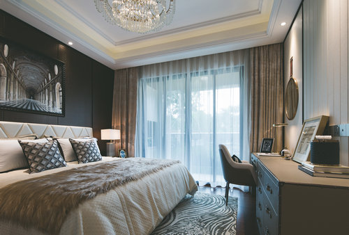 而主人房軟裝選用了全套淺白的家私與地毯來提亮空間,甄貴毛毯置放在私密空間,瞬間成為空間亮點(diǎn),輕微顯露出來的奢華,回味無窮;簡單、直白的線條與華美的水晶吊燈、物件陳設(shè)結(jié)合在一起,倍顯溫馨。