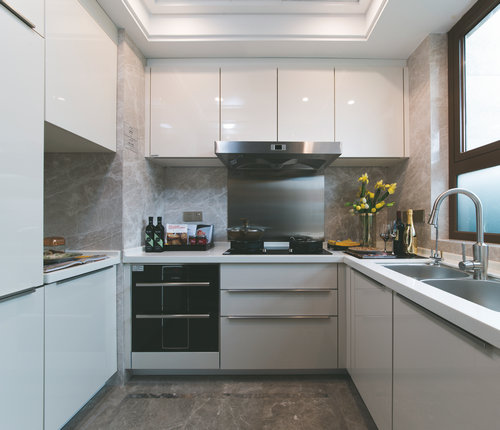 色彩的使用也迎合了含蓄美的理念,采用素色的搭配,不僅讓空間更干凈清爽,也展現(xiàn)了一種干練的高級(jí)美。例如廚房的空間光是色彩的運(yùn)用就充分傳達(dá)了分明的層次,左側(cè)大面積鋪展咖啡色墻體,莊重而不失雅致,右側(cè)則從彩云灰過度到優(yōu)雅白,簡約而不簡單,整體大氣而流暢。