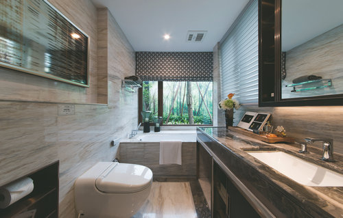 除此之外,陽光、材料、飾品多種元素結(jié)合在一起,達(dá)到一種平衡并且互相映襯的美學(xué)效果。書房的設(shè)計(jì),充分利用了窗戶的采光,小小的陽臺(tái)供閱書或工作疲倦之時(shí)的稍作休息已足夠。地板沿用了伊斯灰大理石,延續(xù)整體空間的設(shè)計(jì);而采用“雪印象”為墻面石材,則是強(qiáng)調(diào)視覺上的開闊,與地面形成對(duì)比。鏡面柜的小物品陳設(shè)錯(cuò)落有致,更顯空間井井有條。