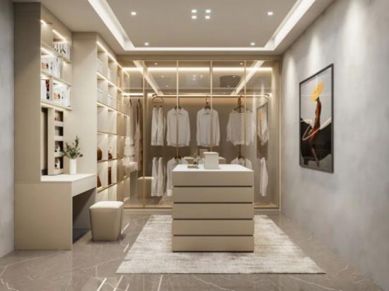 柜體收納可采用定制柜或成品柜,大容量的空間滿足日常收納,但避免柜體完全封閉造成空間的壓抑感,可以選擇采用半開放式柜體設計,或者玻璃門、隱形柜門把守設計。